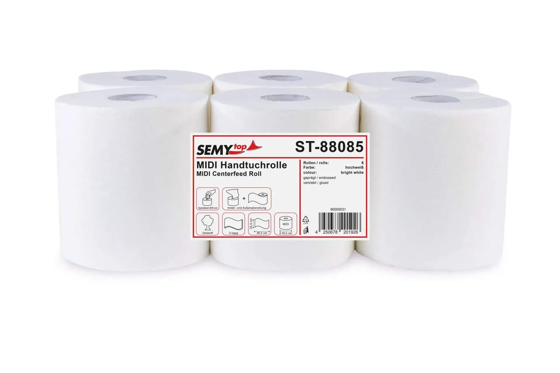 SemyTop Handtuchrolle MIDI, 2-lagig, Zellstoff weiß, 6 Rollen