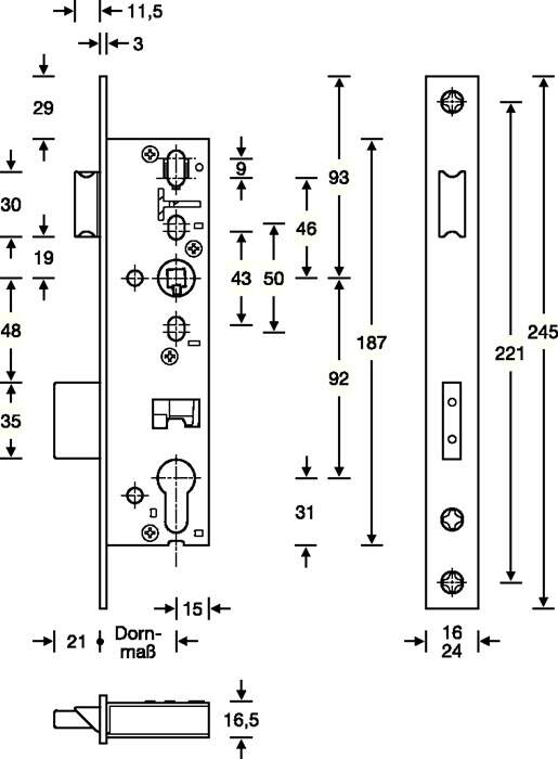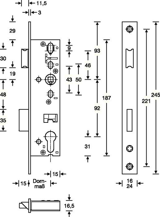 Rohrrahmen-Einsteckschloss, PZW 24/30/92/8 mm, DIN links / rechts, Edelstahl, Riegelausschluss 15 mm, 245 mm