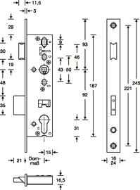 Rohrrahmen-Einsteckschloss, PZW 24/25/92/8 mm, DIN links / rechts, Edelstahl, Riegelausschluss 21 mm, 245 mm