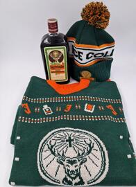 Jägermeister Retro Bottle mit Mütze und Pullover Grösse L