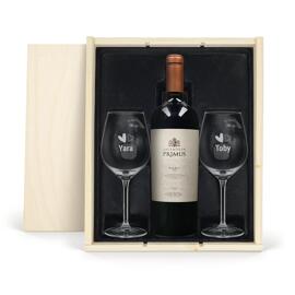 Präsentbox mit Wein, gravierten Gläsern und Snacks