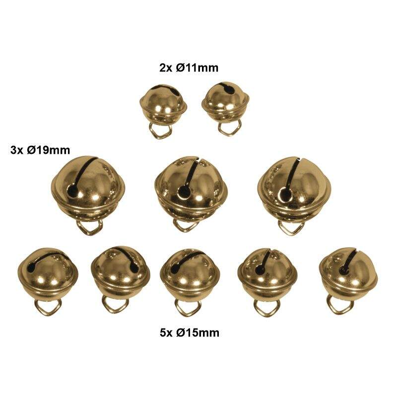 Goldfarbige Rollenglöckchen, Metallglöckchen MIX Ø11mm, Ø15mm, Ø19mm