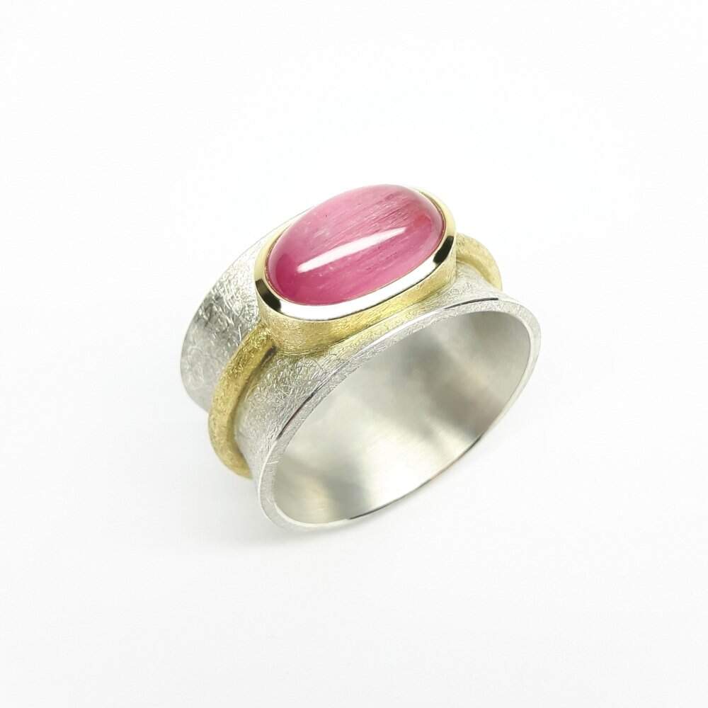 Ring made of 18k yellow gold, 925 sterling silver, and pink cat's-eye tourmaline. One of a kind.