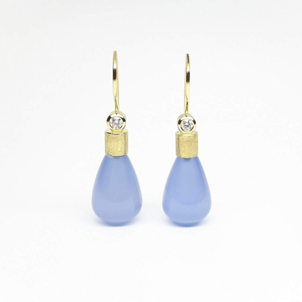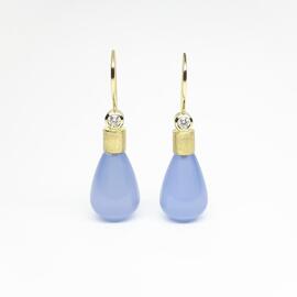 Drop earrings in 18k yellow gold, chalcedony and diamonds. One of a kind.