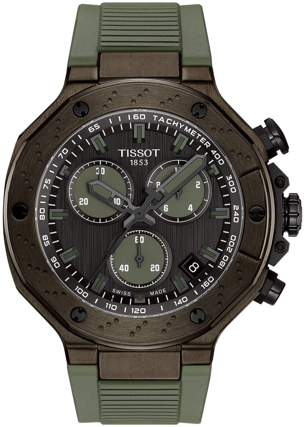 Tissot T-Race watch, quartz movement, chronograph, 45mm black case and green silicone strap