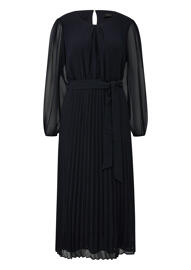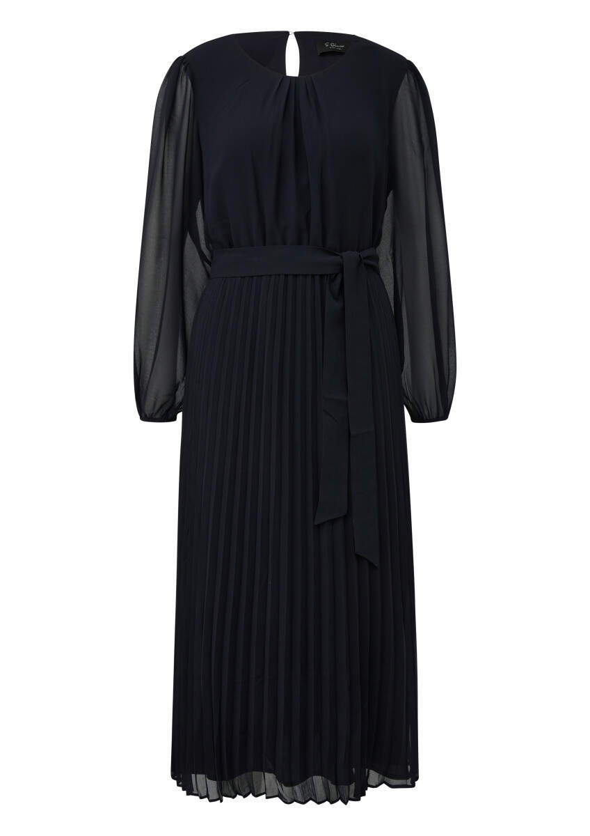 Midi dress with a pleated skirt and semi-sheer sleeves.