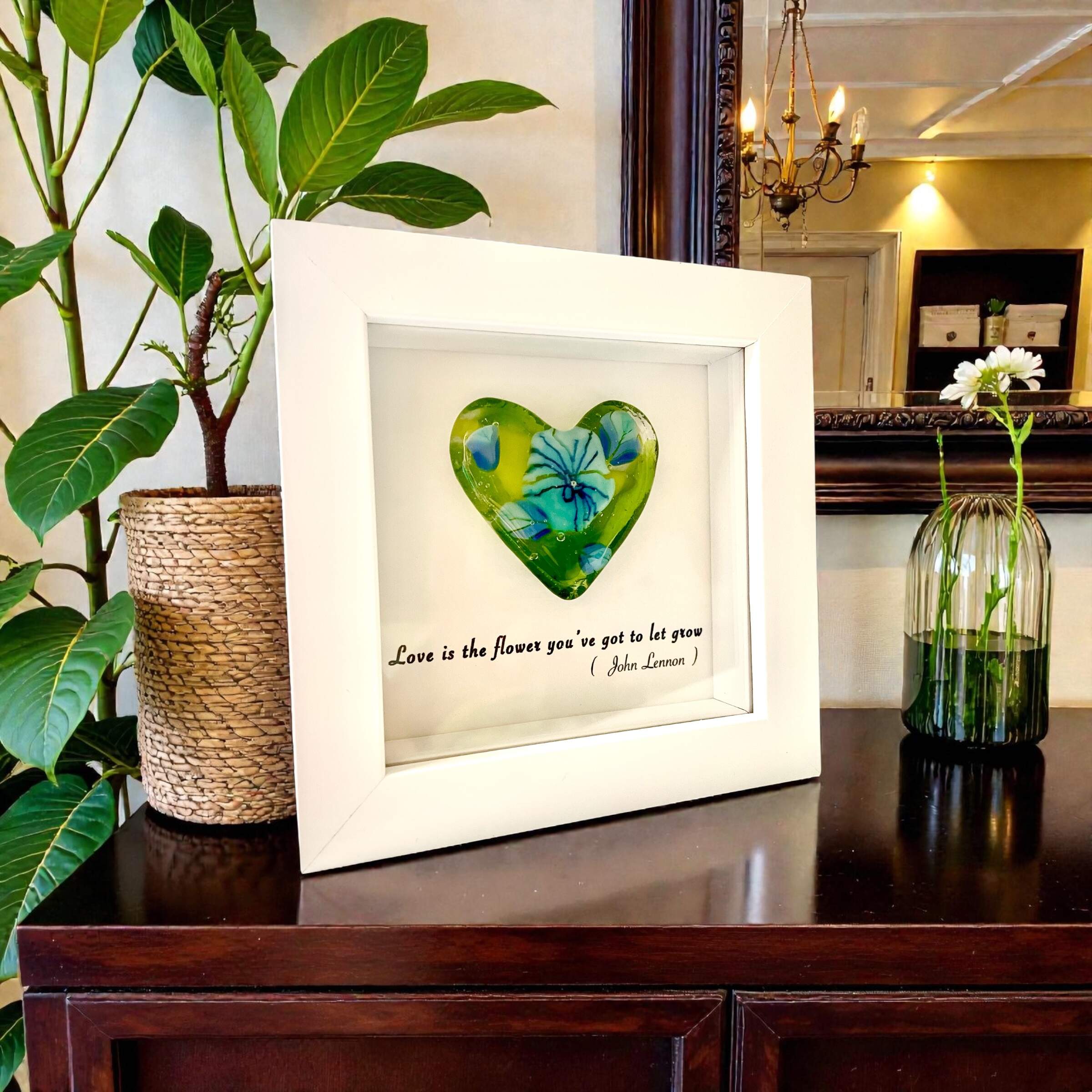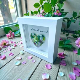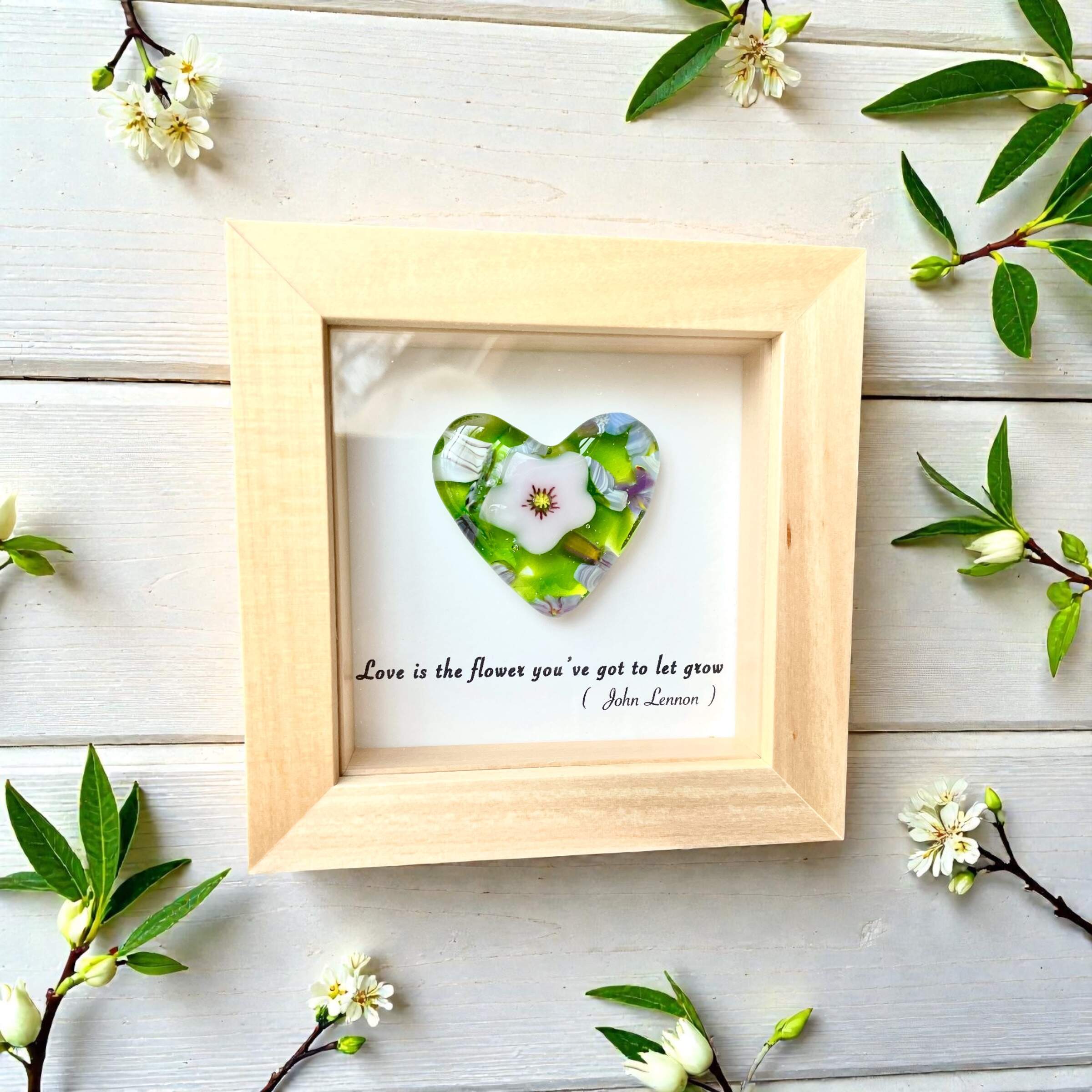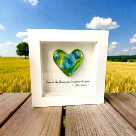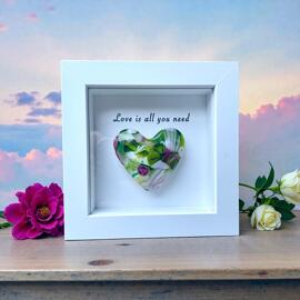 Millefiori glass heart in a white wooden frame, one-of-a-kind, handmade