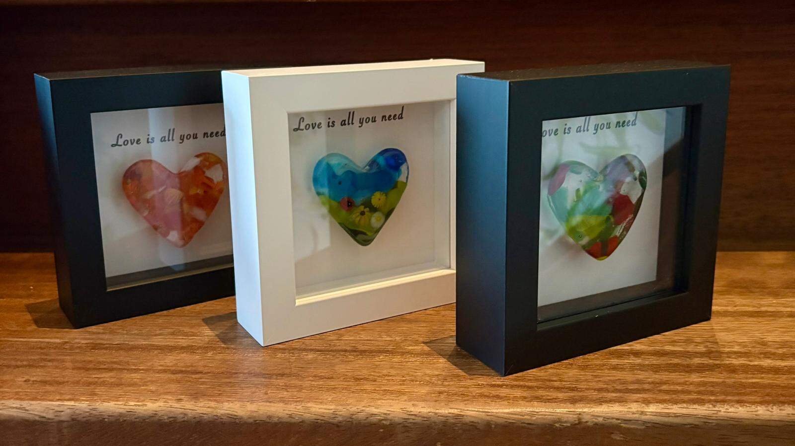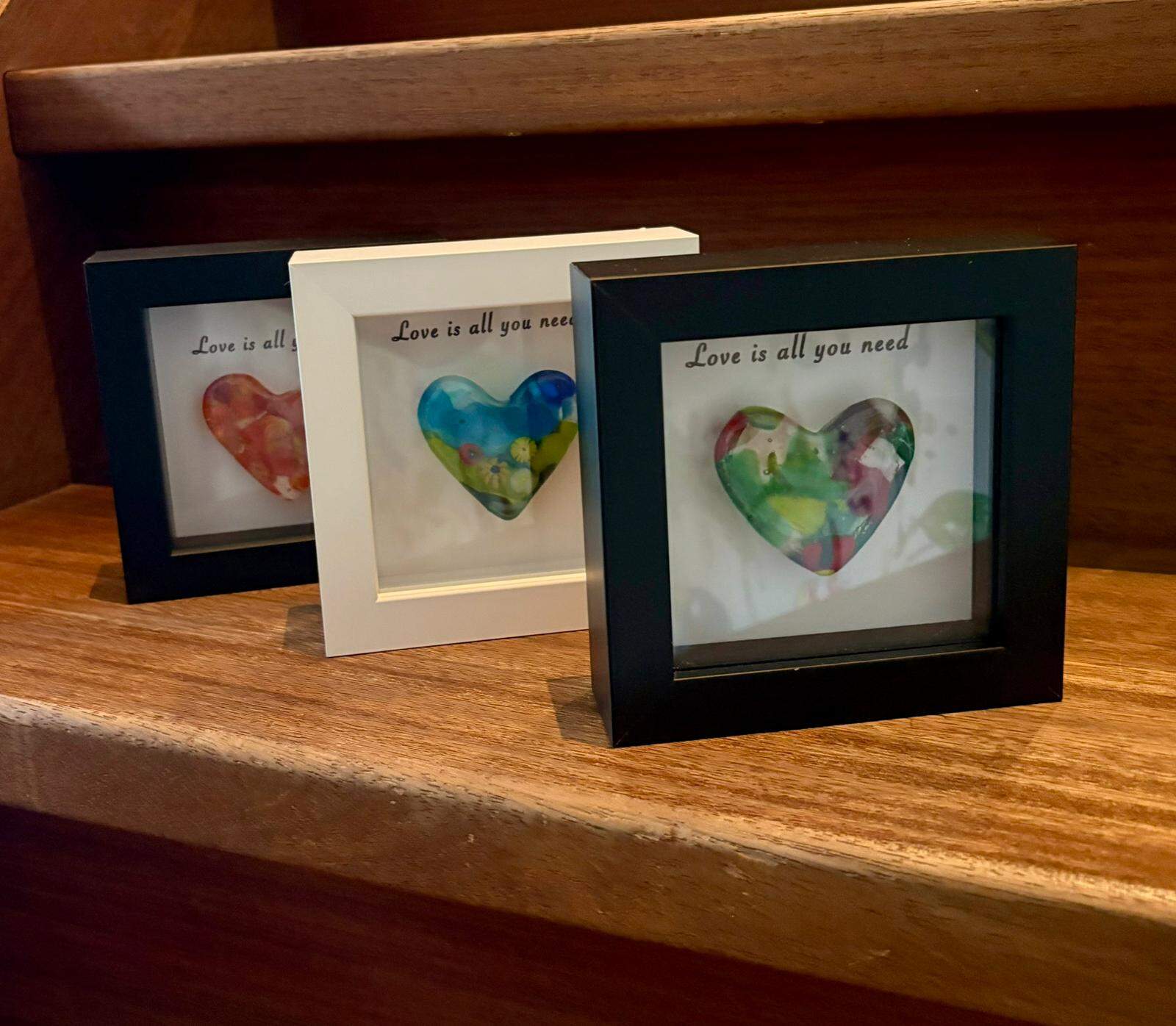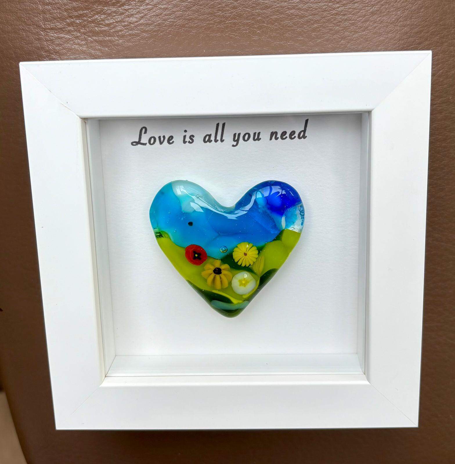 Millefiori glass heart, one-of-a-kind, handcrafted in a white wooden frame