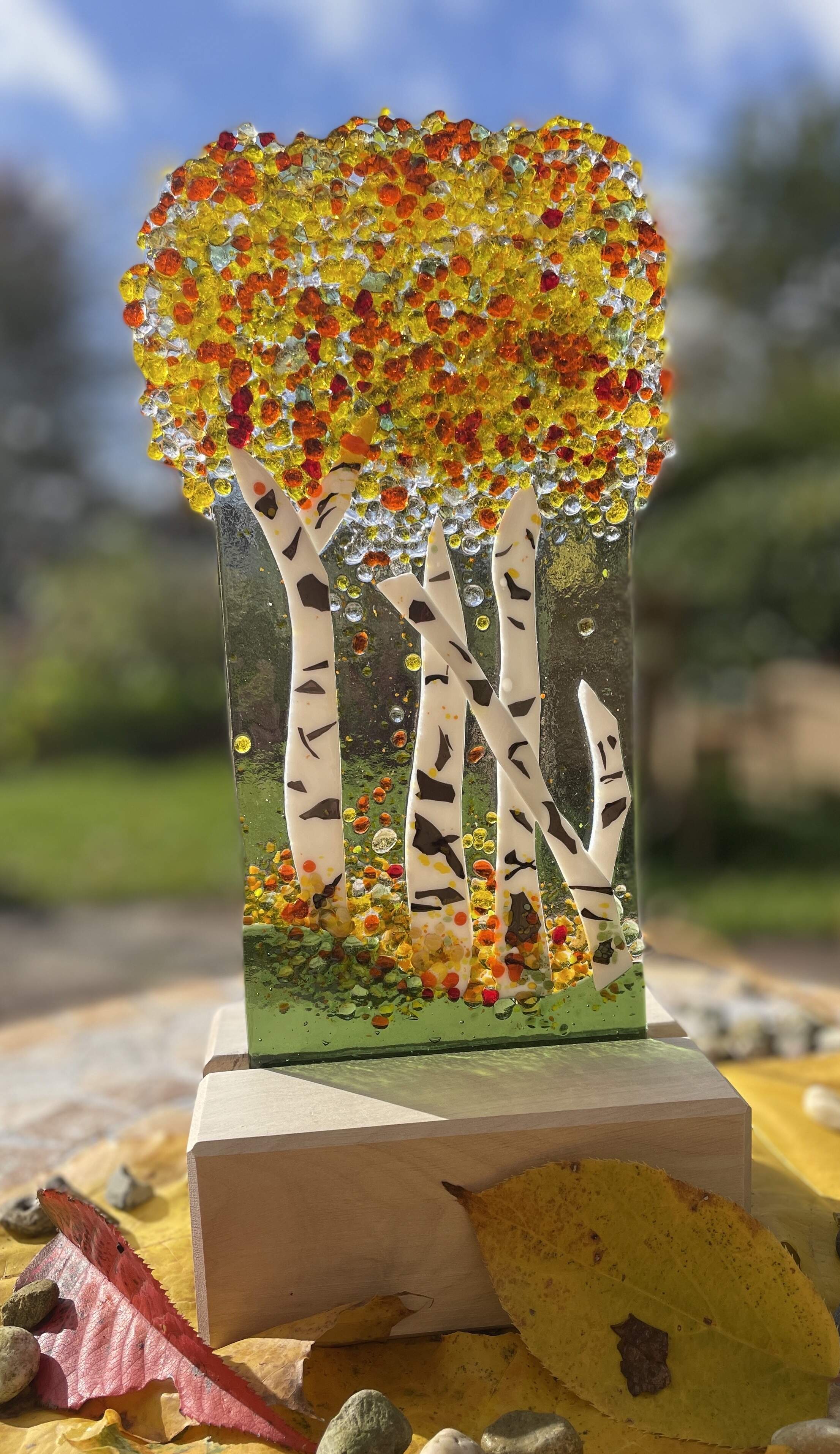 “Indian summer” autumn motif made of glass and birch, one-of-a-kind, handmade