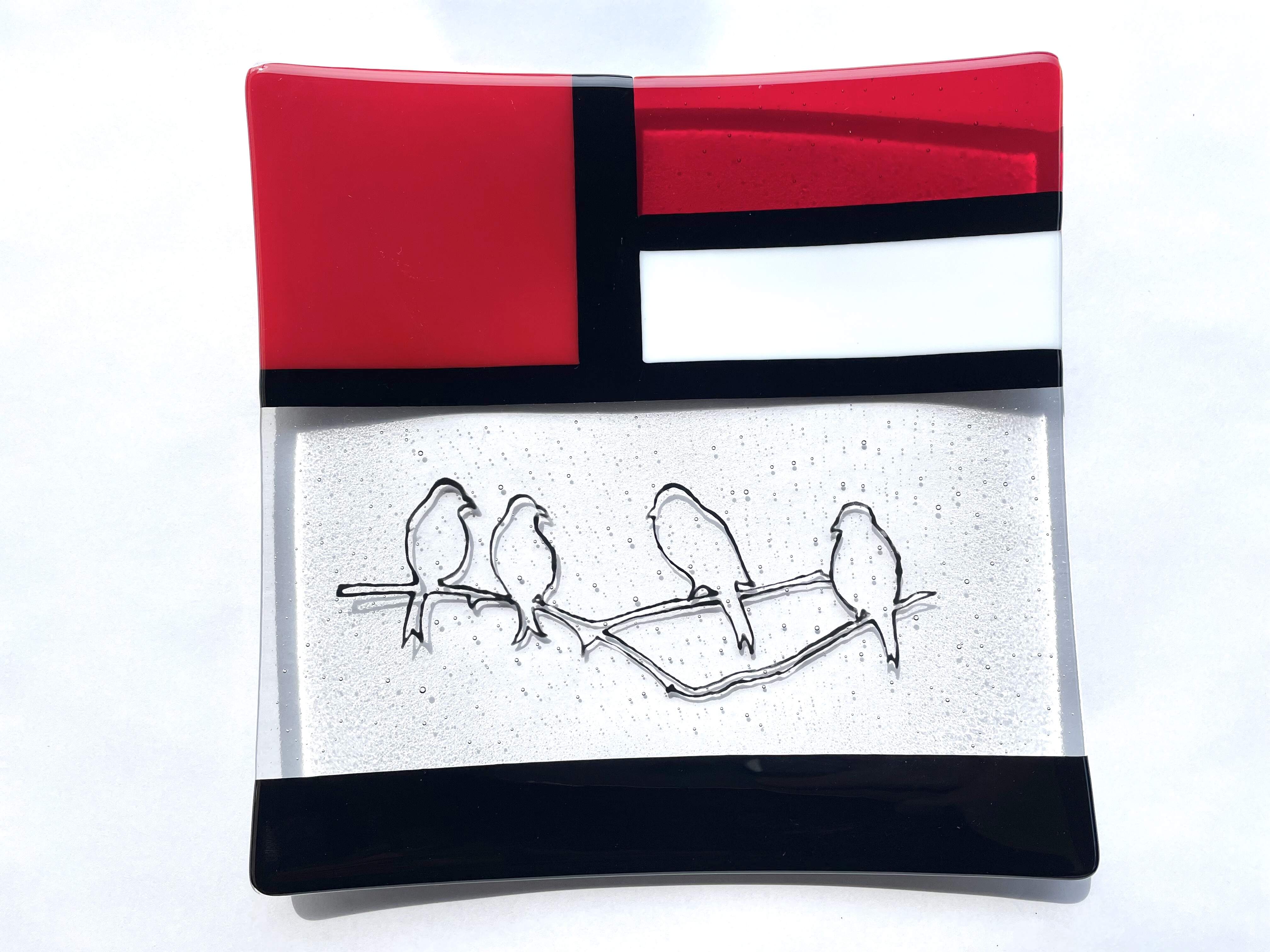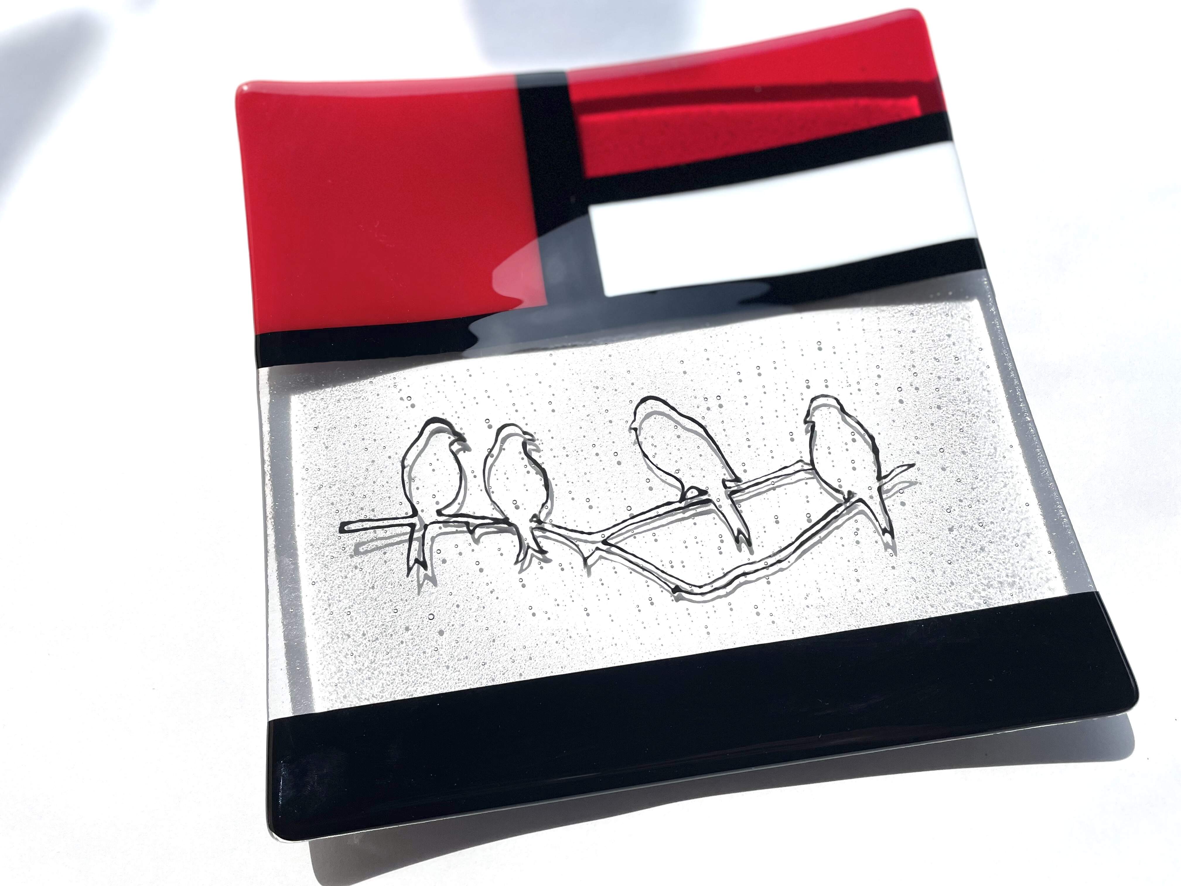 Square glass bowl, "Mondrian & birds" handmade, red, unique piece