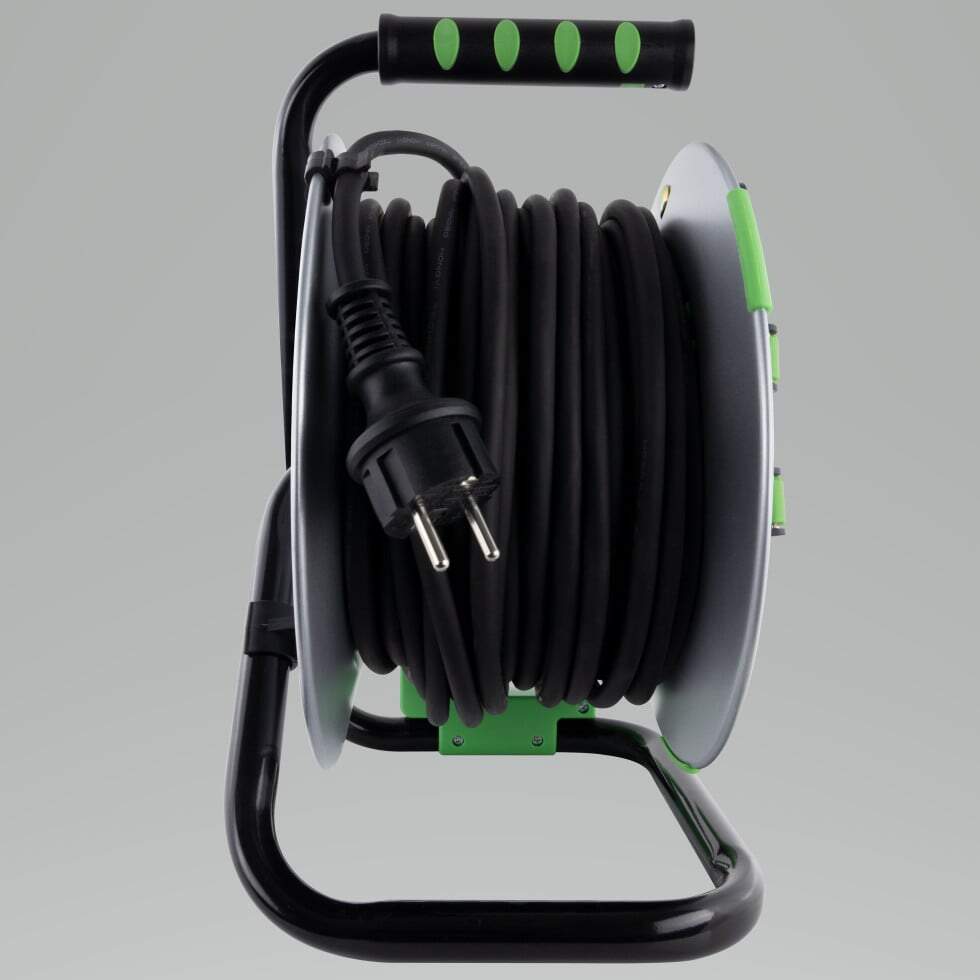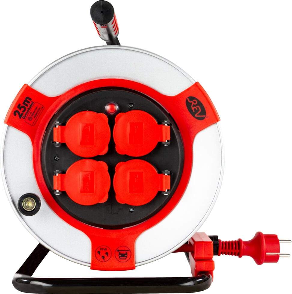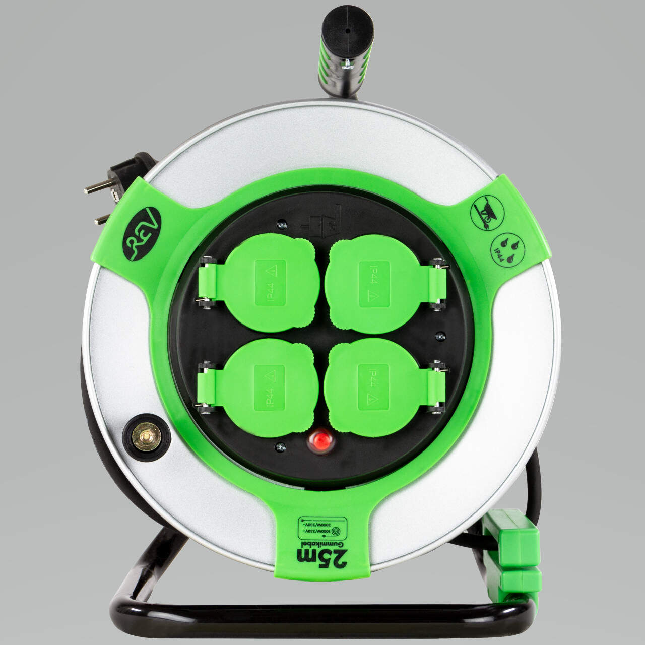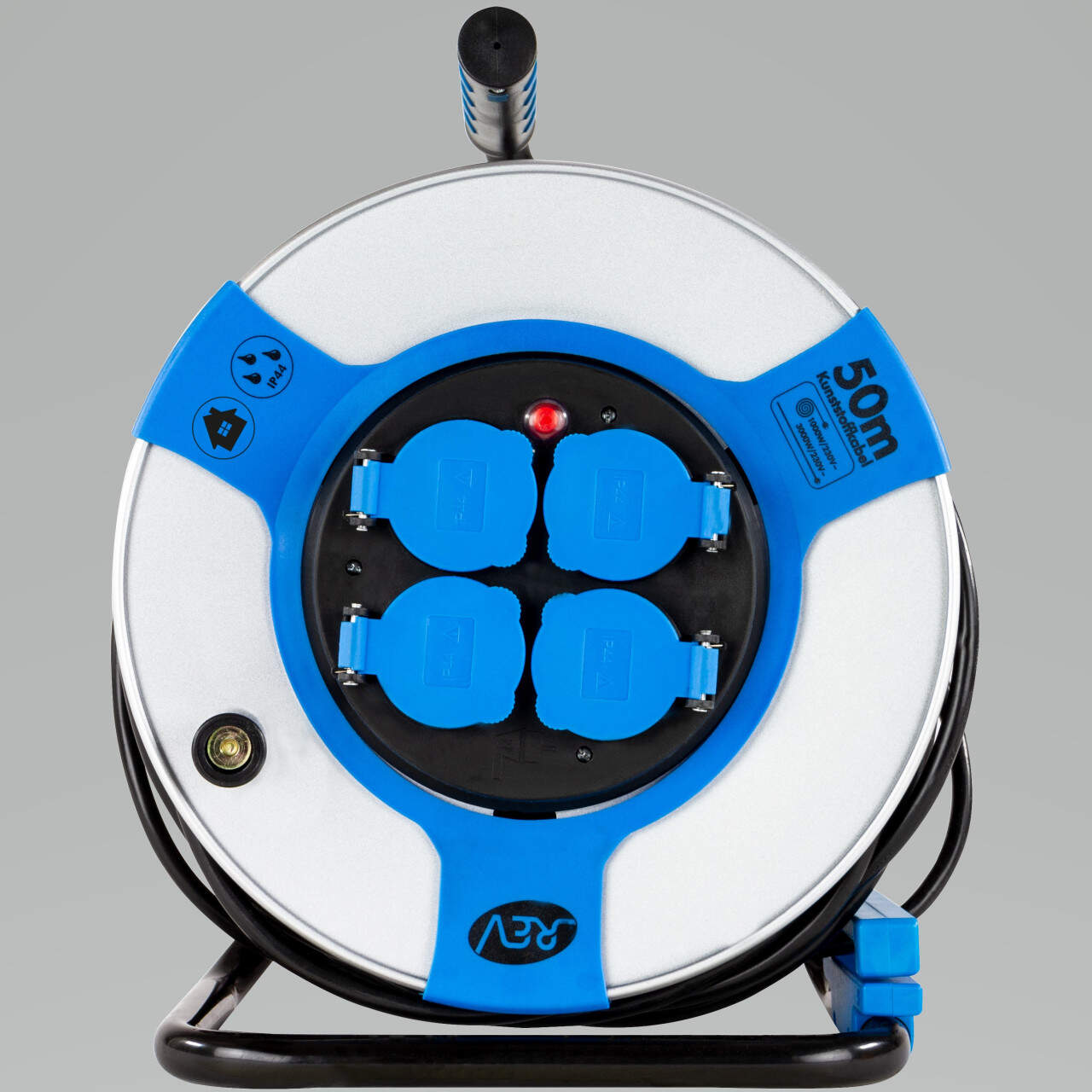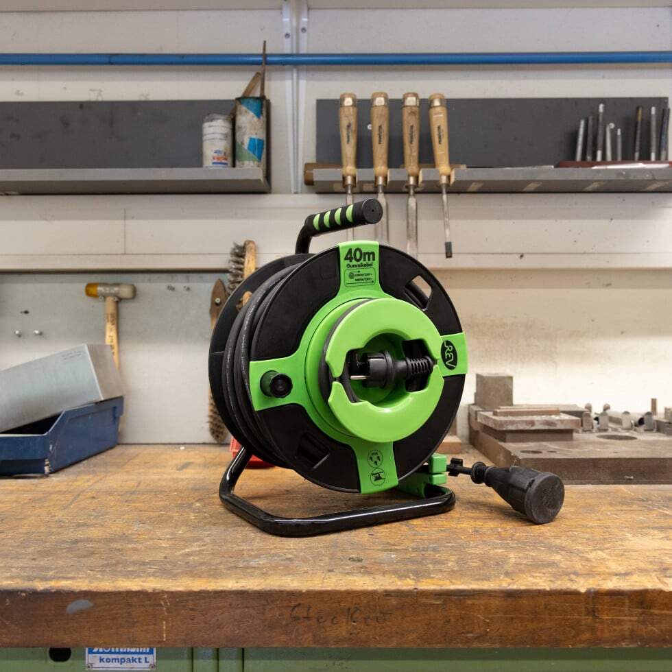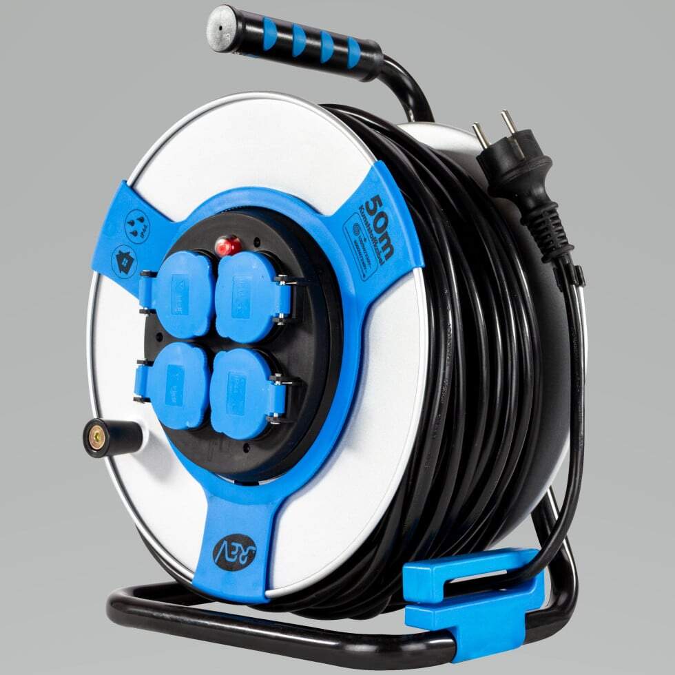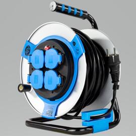 REV Enrouleur de câble intérieur de 10 m H05VV3g 1,5 mm² bleu pétrole, 3 prises Schuko