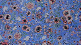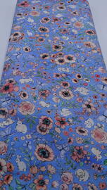 tissu en coton, Bunny Lane by Briar Hill Designs (diverses fleurs roses+lapins sur fond bleu clair)