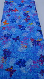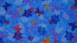 tissu en coton, Leaflet (papillons colorés + feuilles sur fond bleu à carreaux)