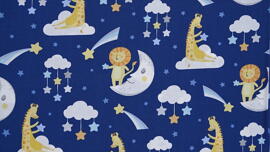tissu coton, Baby's Adventure by Arrolyn Weiderhold (Lune, nuages, étoiles, girafe et lion sur bleu foncé)