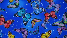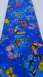 tissu en coton, papillons colorés sur fond bleu