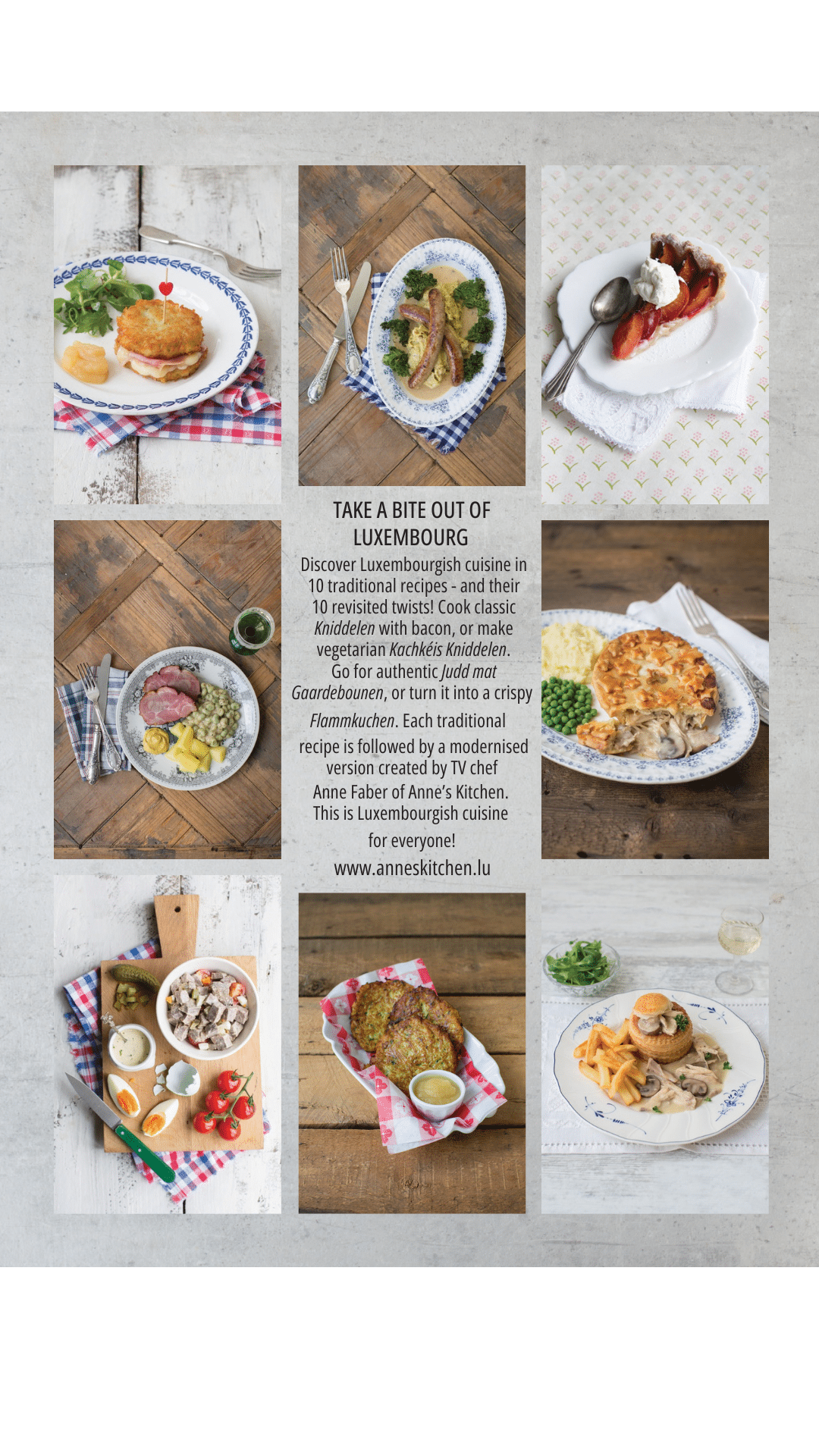 Inspirez-vous de la cuisine luxembourgeoise avec la Cuisine d'Anne ! Consultez les livres de cuisine d'Anne ou préparez des biscuits en forme de Luxembourg avec les emporte-pièces en forme de Luxembourg d'Anne ! Un nouveau livre de pâtisserie et une collection d'épices seront disponibles à l'automne !